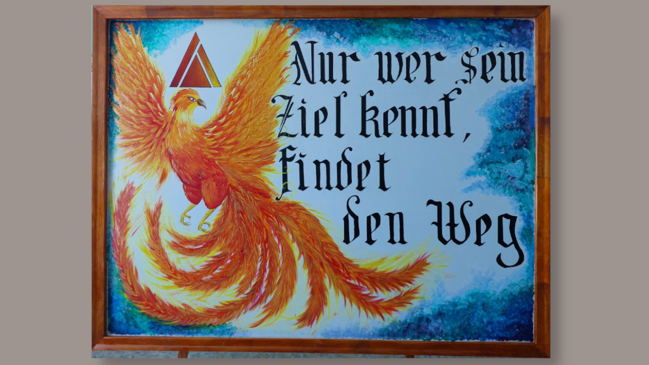 Акриловыми красками на масляной основе написали изречение на немецком языке и изобразили символ района – феникса. Шпрух традиционно поместили в рамку. Основой послужила обычная фанера, поскольку заказанный из Москвы холст никак не приходил, а время поджимало. Но, наверное, именно благодаря фанере шпрух получился прям аутентичным, таким, как его делали наши предки».